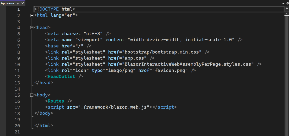 As we might expect, the <HeadOutlet> and <Routes> tag have @rendermode="InteractiveWebAssembly. Compare this with Server Interactive where render mode was @rendermode="InteractiveServer".