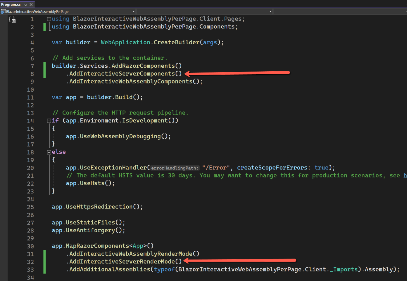 Open "Program.cs" in the main project. Notice that that .AddInteractiveWebAssemblyComponents has been included in the builder.Services section and .AddInteractiveWebAssemblyRenderMode();has been added to app.MapRazorComponents(). "Program.cs" in the .client project does not have anything specific about render modes.
