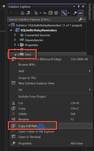 Return to Visual Studio and in the Solution Explorer open the Data folder. If Birthdays.db is not displayed: