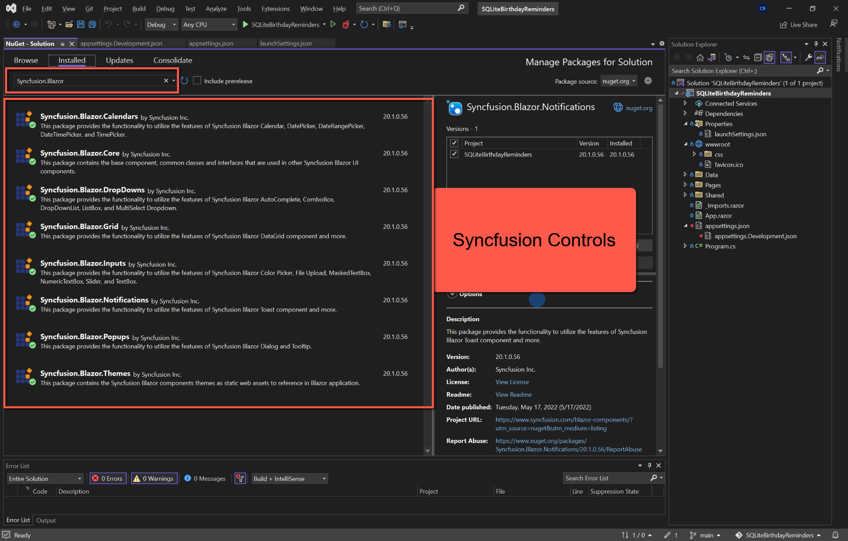 To make things easier for me I simply copied the settings for appsettings.json from the original Birthday Reminders project, and whilst I was making the copy I also copied the settings for smtp mail and the Syncfusion licence.