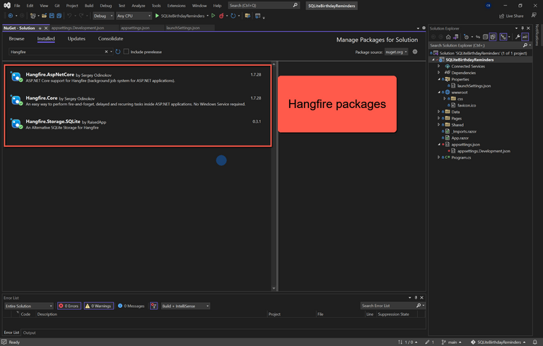 - Hangfire.Storage.SQLite (Note this is SQLite, not Hangfire.SqlServer)