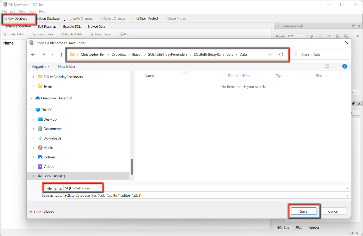 - Enter a name for the database, e.g. 'SQLiteBirthdays', in the File name box and click 'Save'