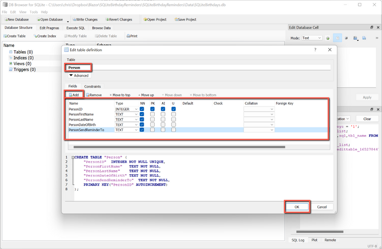 - Select 'SQLiteBirthdays.db' when the file browser opens and click 'Add'