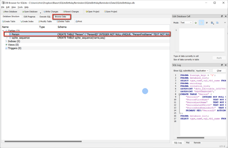 Although I have defined a Primary Key, this isn't strictly necessary This is because, unless specified otherwise, a 'rowid' is automatically added to the table definition. This is an auto-incrementing integer. There is therefore no need to specify a separate primary key field. This is covered in this article in https://sqlitetutorial.net. However, to mimic the original Bithdays SQL Server database I have included 'PersonID'.