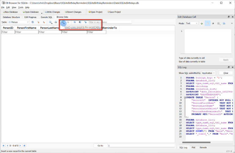 - To add data, in the toolbar above the grid, click the tiny button under 'Browse Data' with the downward pointing arrow. It has the tooltip 'Insert a new record into the current table'. (Make sure the whole dialog box is wide enough to display all items on the toolbar above the datagrid.)