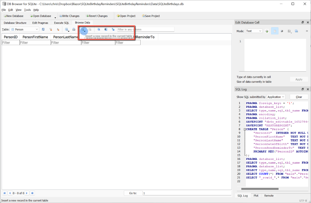 Whilst we have DB Browser for SQLite open we can take the opportunity to enter some sample data; this will make testing our Blazor application a little easier.