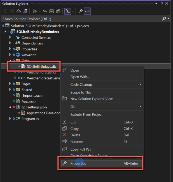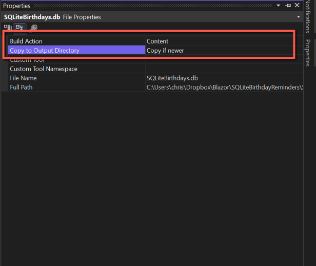 Before we leave Birthdays.db in Solution Explorer, we can set one of the properties of the database so that when we publish the application the database is included in the package.