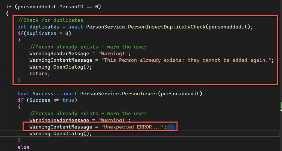 The above uses a new Service called 'PersonInsertDuplicatesCheck', which is where the count for duplicates is carried out. The 'personaddedit' object is passed to this service.