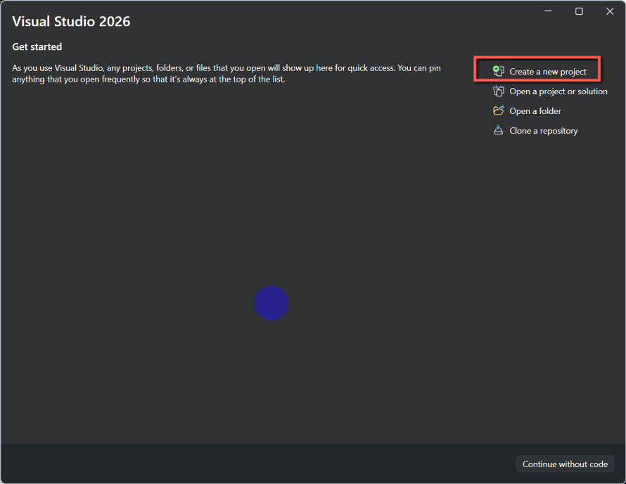 Open Visual Studio (I'm using Visual Studio 2026 - Community Edition)