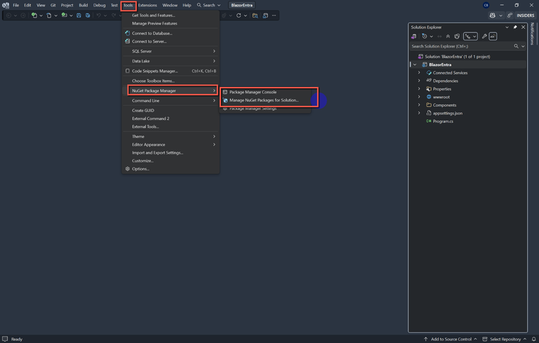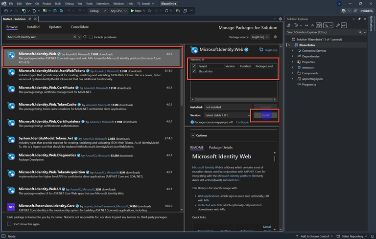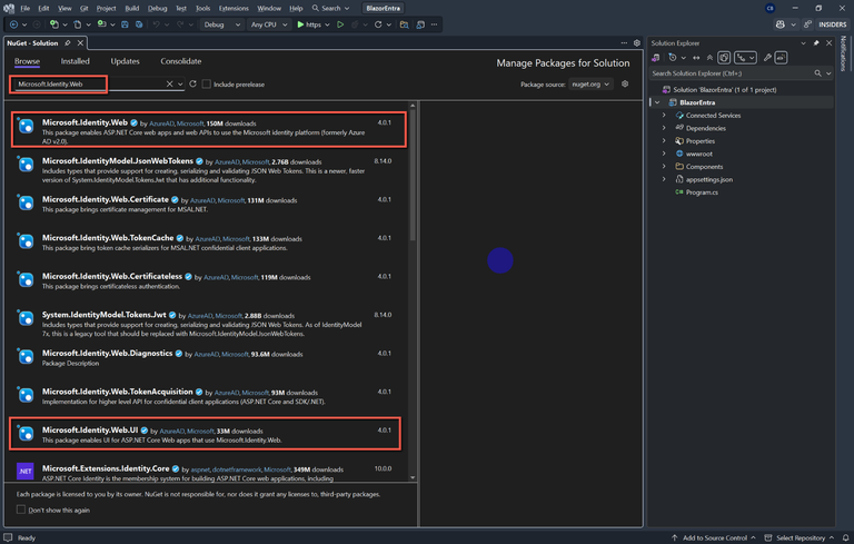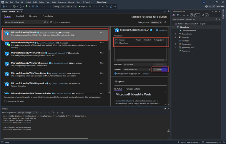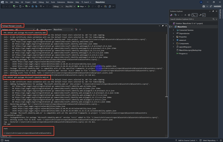 dotnet add package Microsoft.Identity.Web.UIIn the above example I used the NuGet Package Manager Console, but note that I had to change directory to ..\repos\BlazorEntra\BlazorEntra