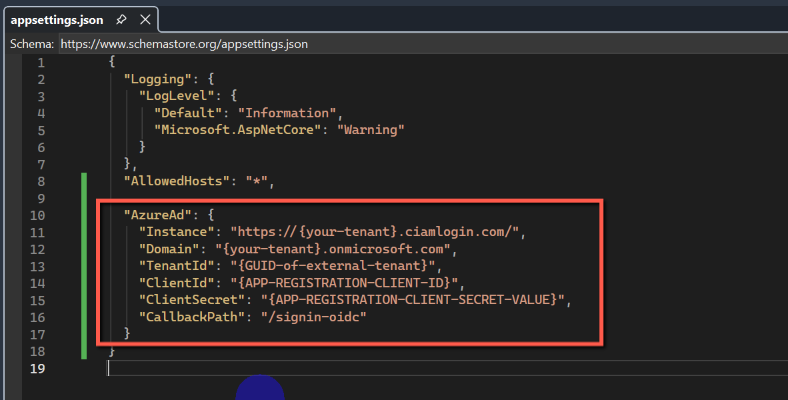 "ClientSecret": "{APP-REGISTRATION-CLIENT-SECRET-VALUE}",