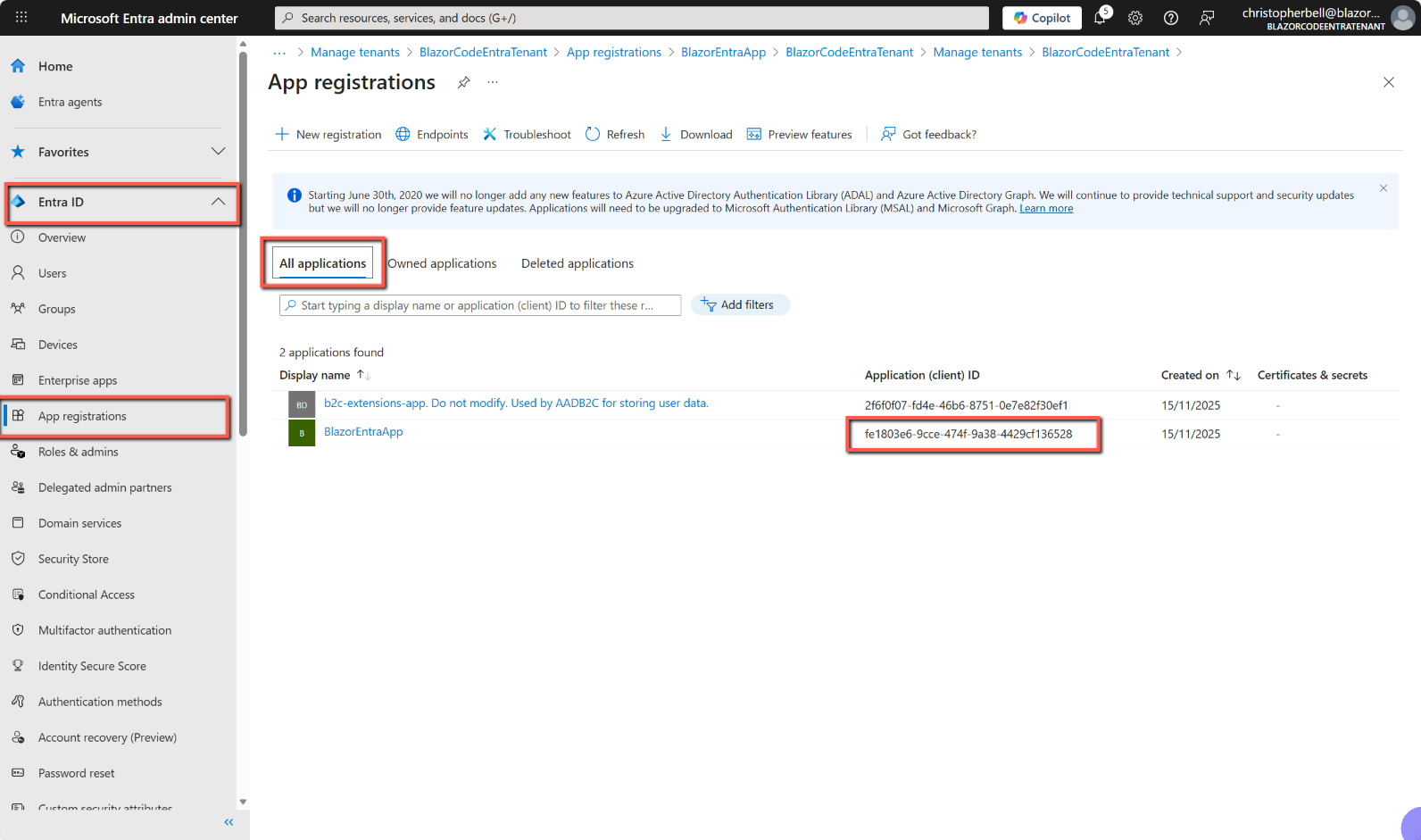 - To find the {APP-REGISTRATION_CLIENT_ID} select Entra ID > App registrations > All applications. The Application (client) ID is displayed in the column with the same name.
