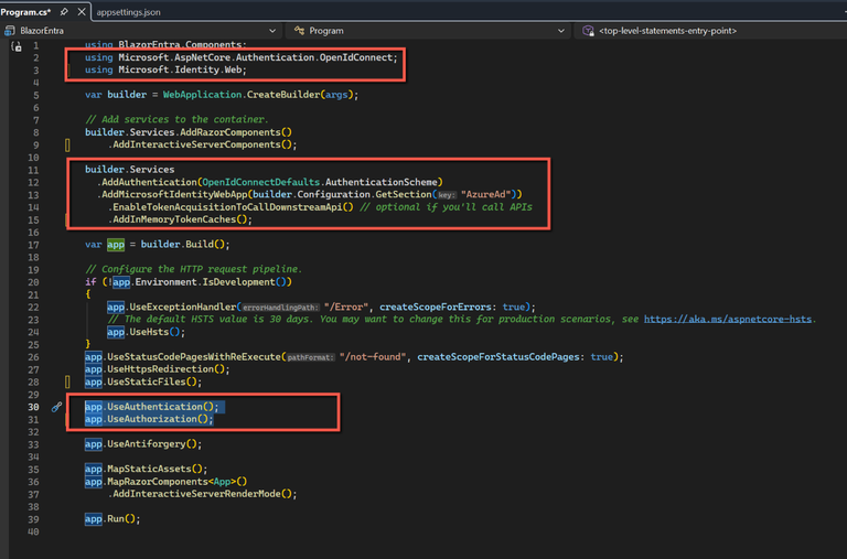 using Microsoft.Identity.Web;- In the builder section insert the following: