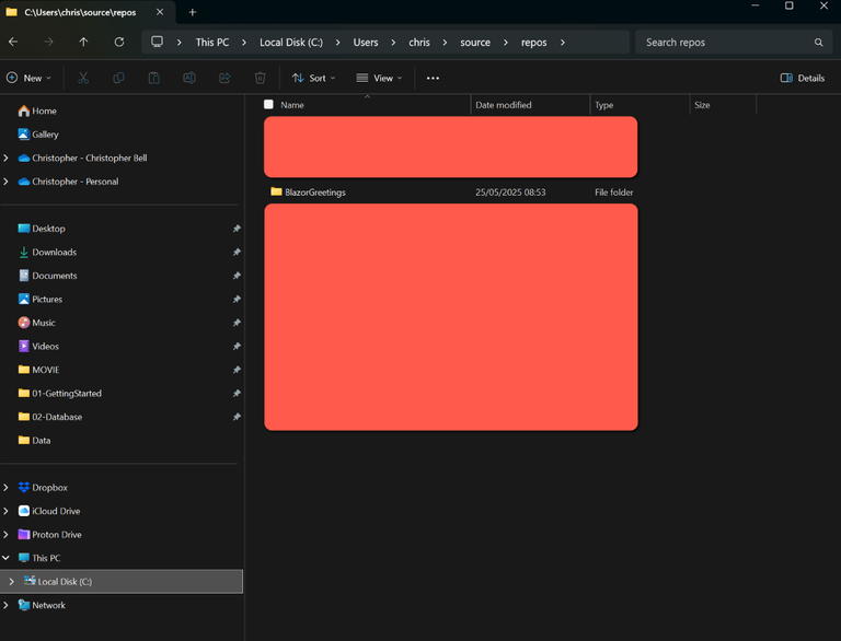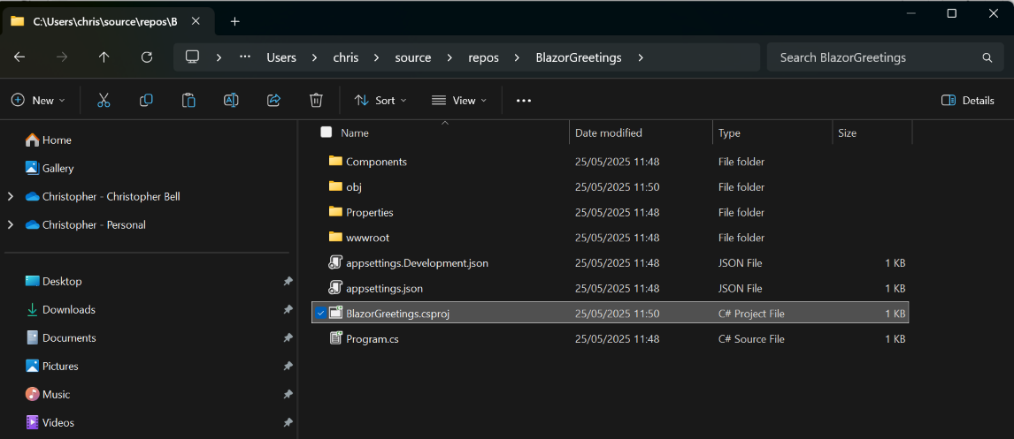 In File Manager I created a folder in my default 'repos' directory for the new solution. I named it 'BlazorGreetings'. This will be the name of the solution/project and namespace, so best to get this right from the start.
