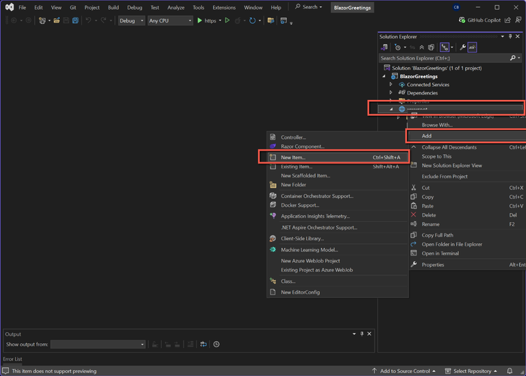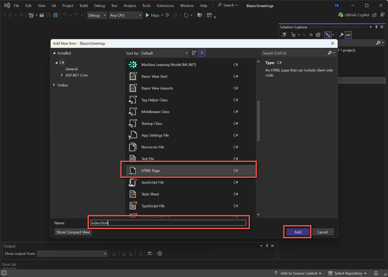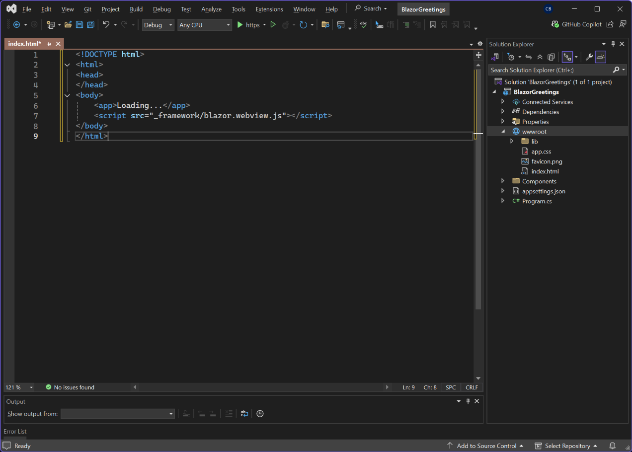 - In the above, change the namespace to your project's name (in my case BlazorGreetings)