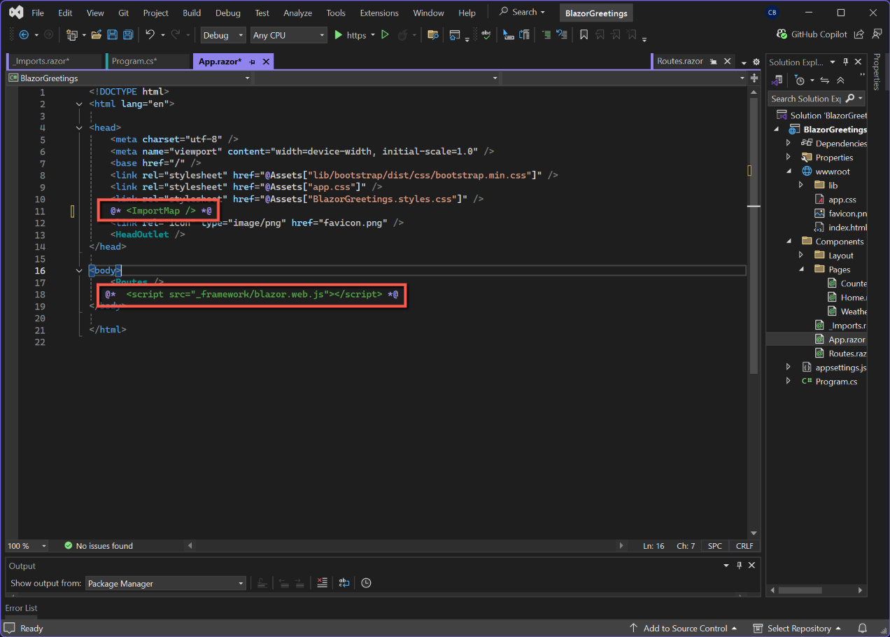 appBuilder.RootComponents.Add<App>("app"); has a red squiggle under <App>. This will eventually disappear. Closing and re-opening the solution appears to solve this problem.)