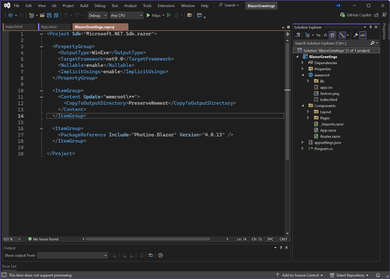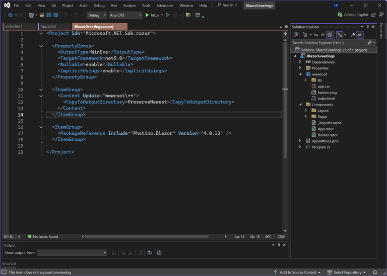 In File Manager browse to the project folder and open the csproj file (in my case BlazorPhotinoGreetings.csproj) with Visual Studio