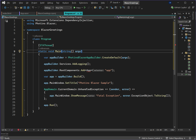 - (I also had to add 'using Photino.Blazor;' at the top of the file - the only difference I found from Nathan Wilson's instructions)