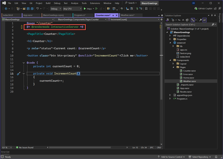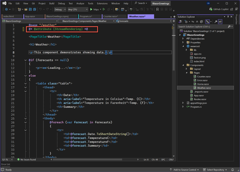 @rendermode InteractiveServerfrom Counter.razor@attribute [StreamRendering]from Weather.razor