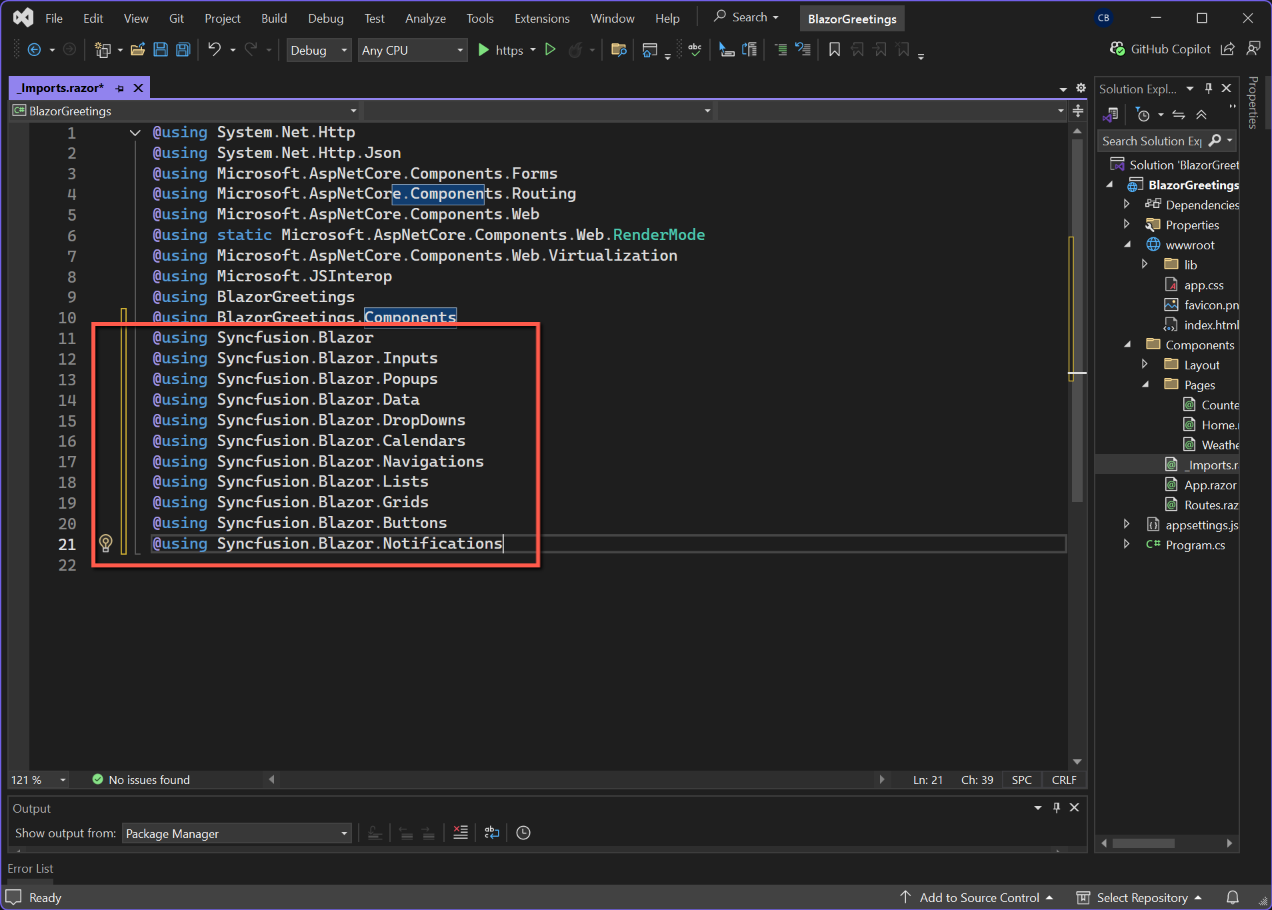 Open '_Imports.razor' and add the following Syncfusion control names. (This is not the complete set, you may need to add additional controls according to your needs.)
