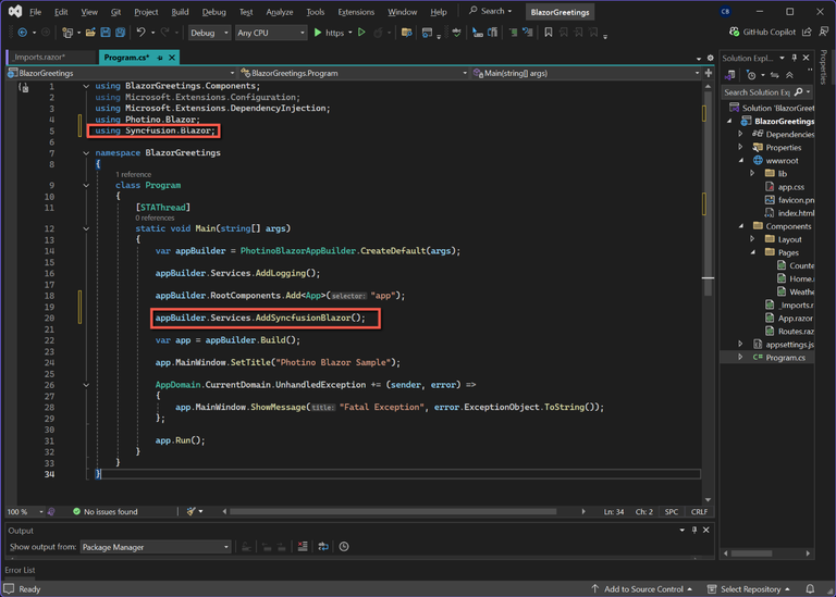 using Syncfusion.Blazor;and the following in the // Add services to the container.
