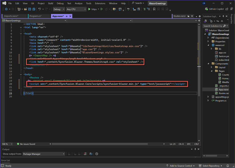 appBuilder.Services.AddSyncfusionBlazor();App.razor