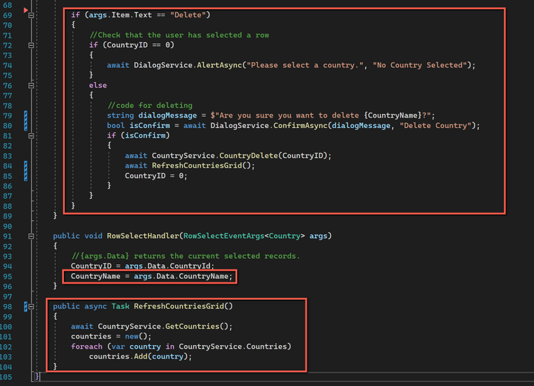 private string CountryName = string.Empty;I have added a new method called 'RefreshCountriesGrid' as I found myself using the same code to refresh the grid on both initialisation and after deleting a record. (Interestingly this wasn't required after adding or deleting a record.) I have replaced the code to get the countries in the 'OnInitializedAsync' with a call to the new method.