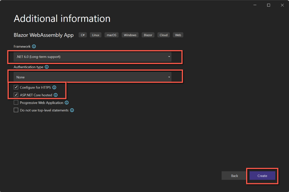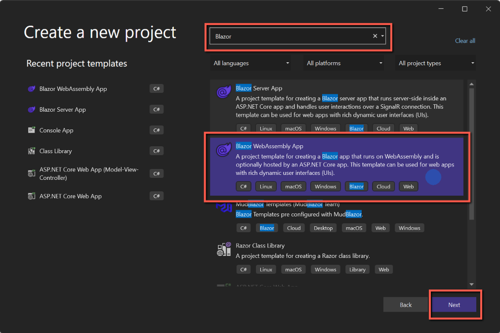 - Enter 'Blazor' in the search box at the top of the form and select 'BlazorWebAssembly App' from the list of options and click 'Next'. (You may see a list of 'Recent Project Templates' on the left of the form, but the above method will ensure you get the correct template.)