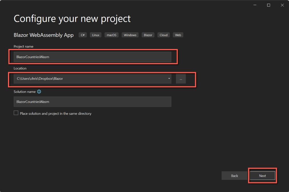 - Leave the 'Solution name' the same as the Project name