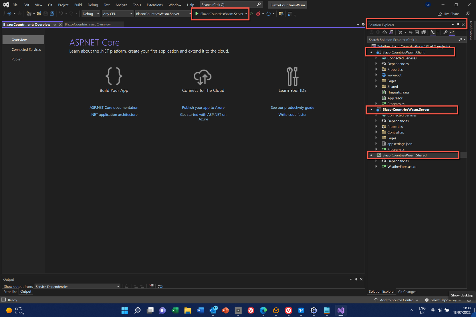 Back in Visual Studio notice that in Solution Explorer there are three projects: one ending with .Client, one with .Server and one with .Shared - if you don't have the three projects check that you selected 'ASP.NET Core hosted' when creating the project.
