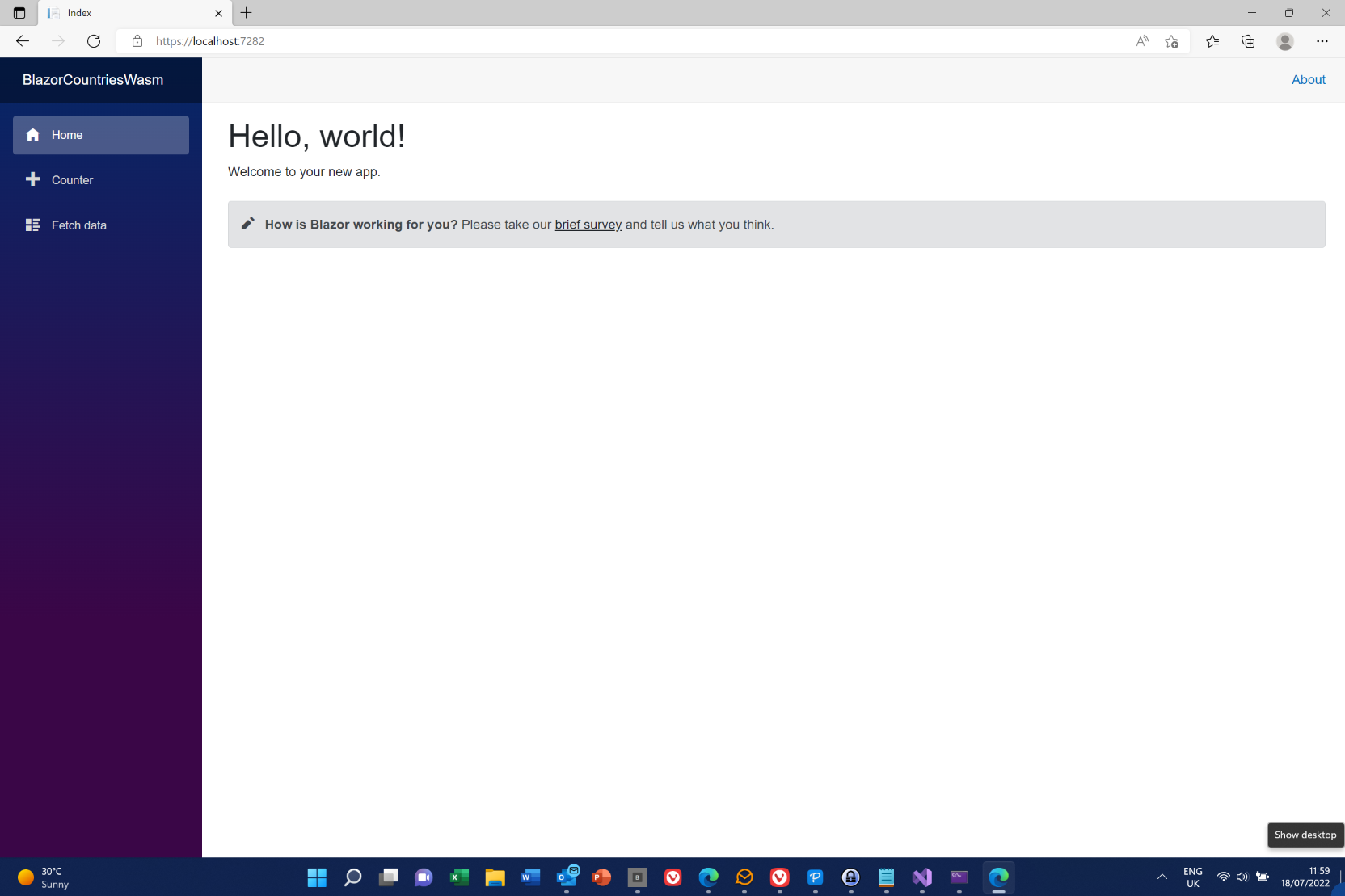 Test the project by running it - click the solid green triangle next to the name of the project in the toolbar - this will be BlazorCountriesWasm.Server (as the Server project has automatically be set as the startup project.). Try the 'Counter' and Fetch Data' pages. Close the application.