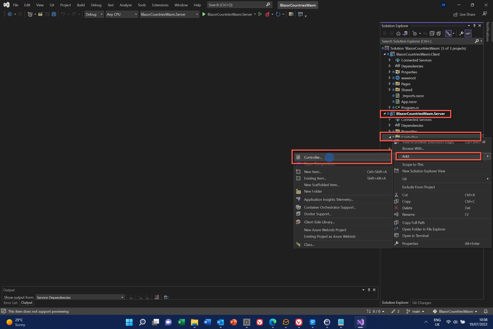 - Right-click on the Controllers folder and select Add > Controller.