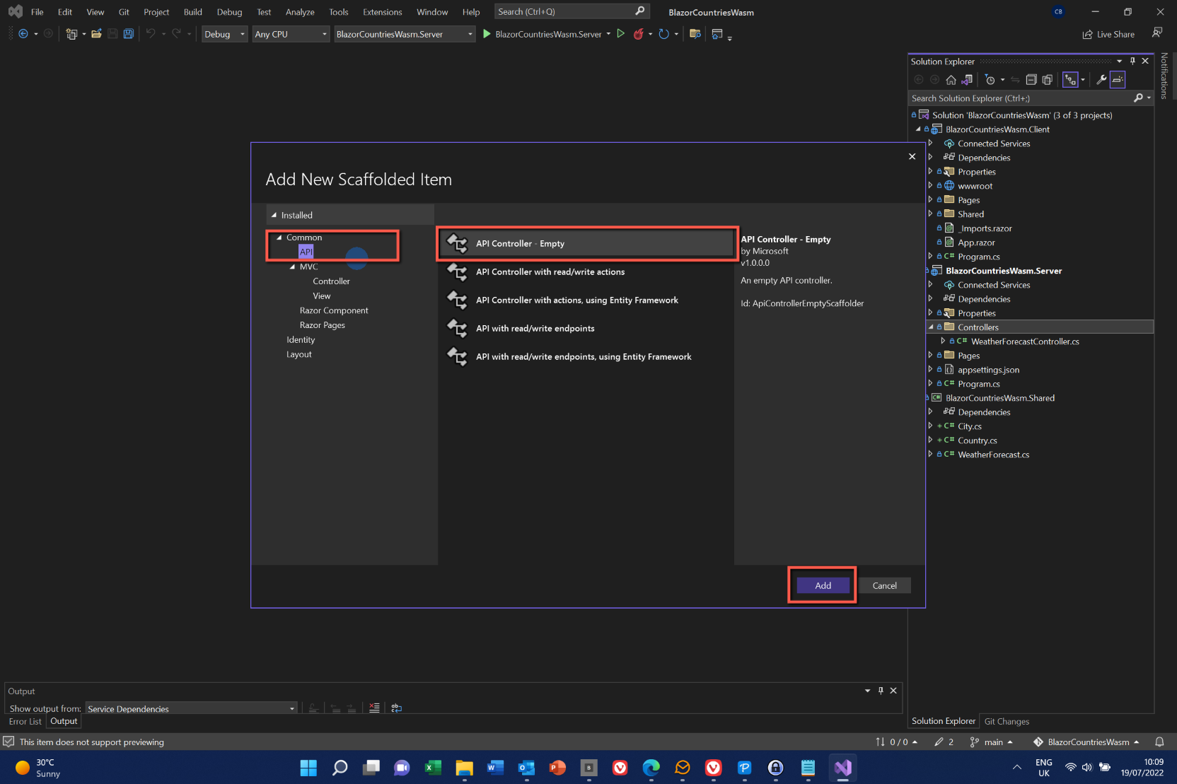 - On the next form select 'API' from the left-hand pane, and then 'API Controller - Empty' from the list. Click 'Add'