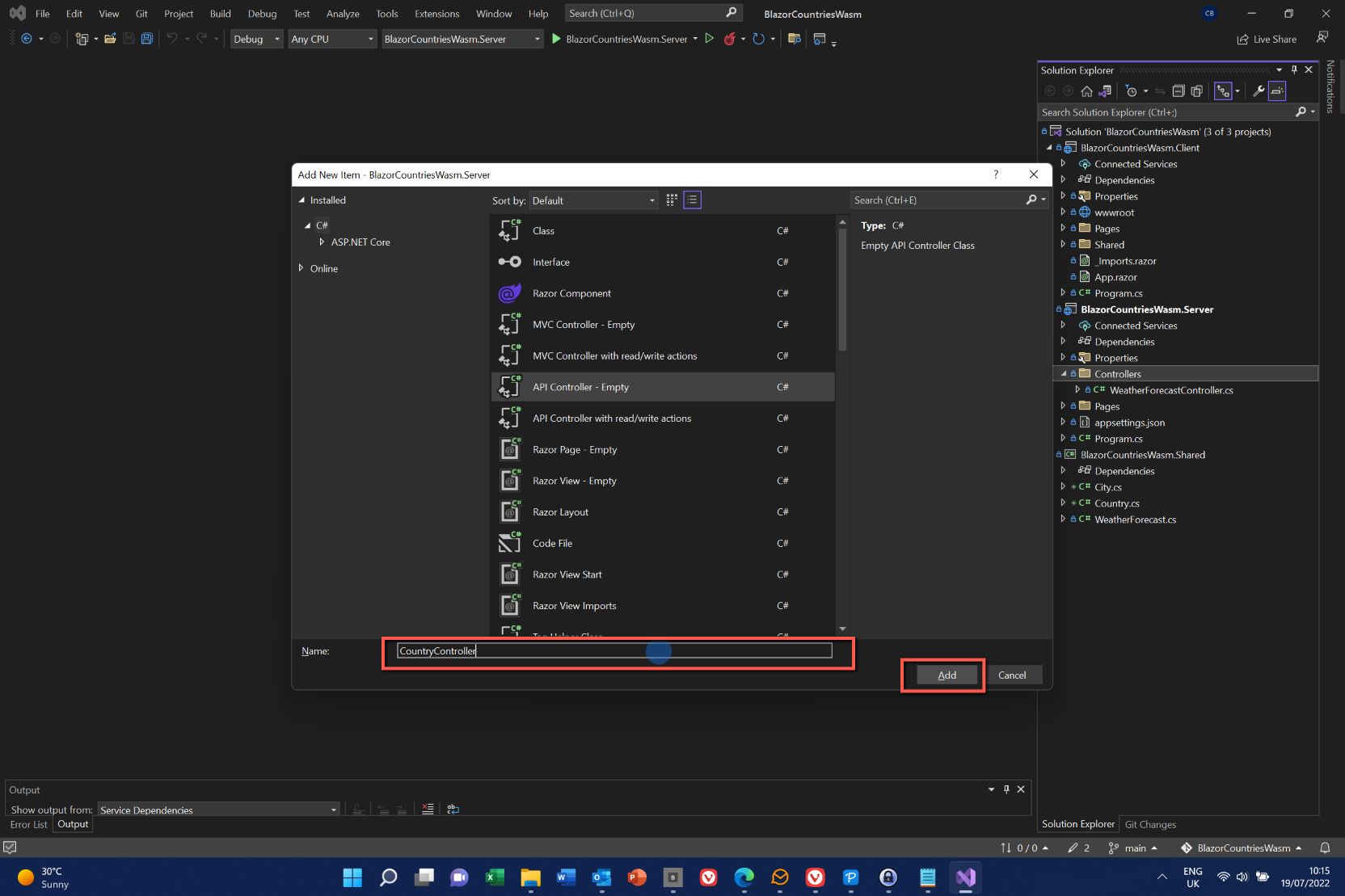 In the Server project there is a folder called 'Controllers' and the template app has already created a 'WeatherForecastController.cs' file. This is where we are going to add controllers for Countries and Cities.