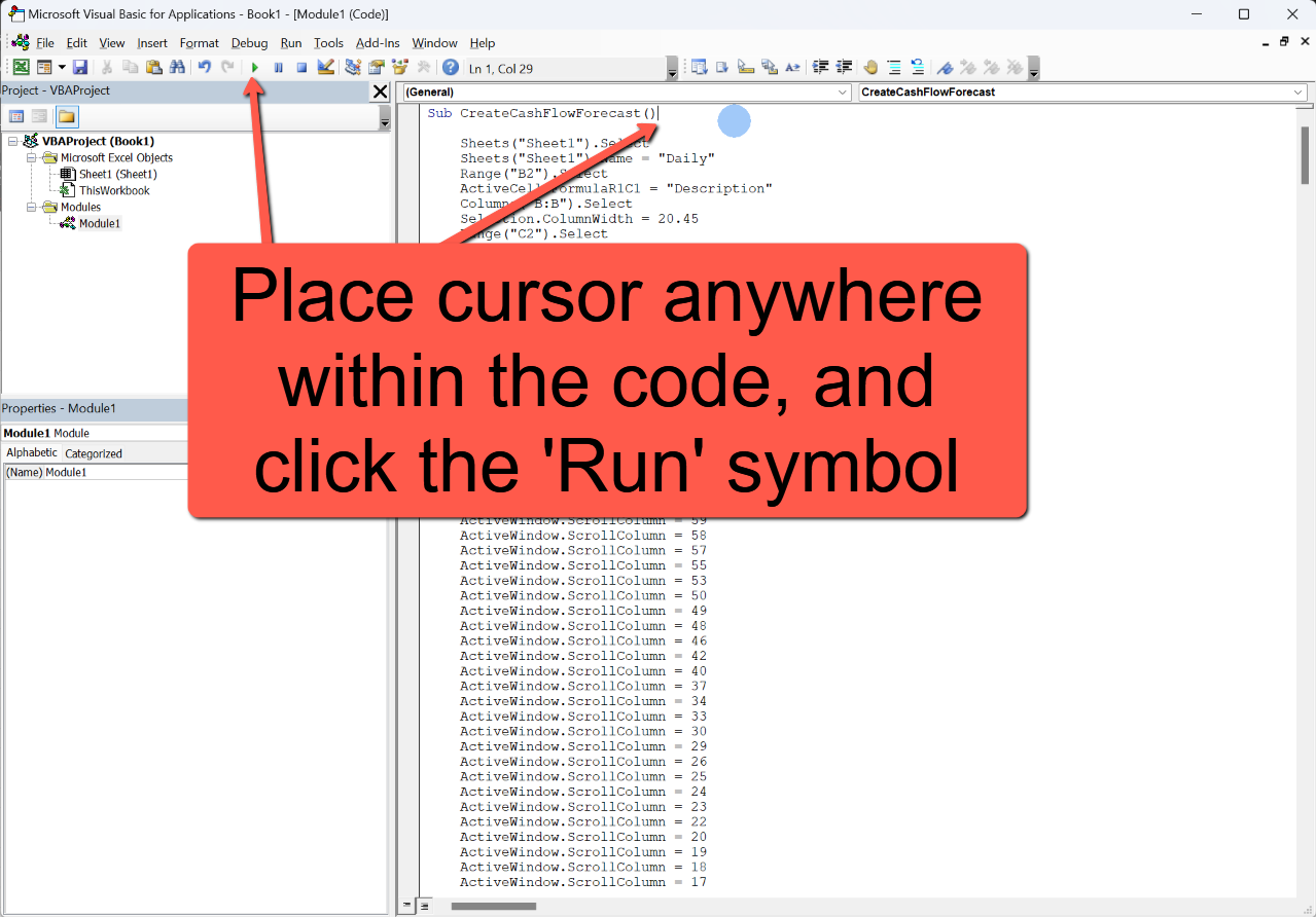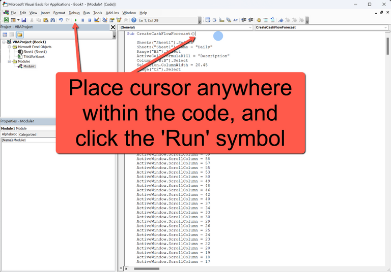 - With the cursor anywhere in the code, click the 'Run' symbol (small green arrow)